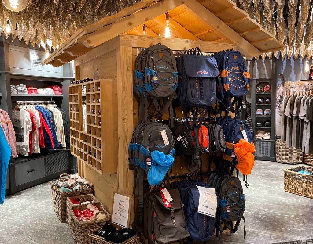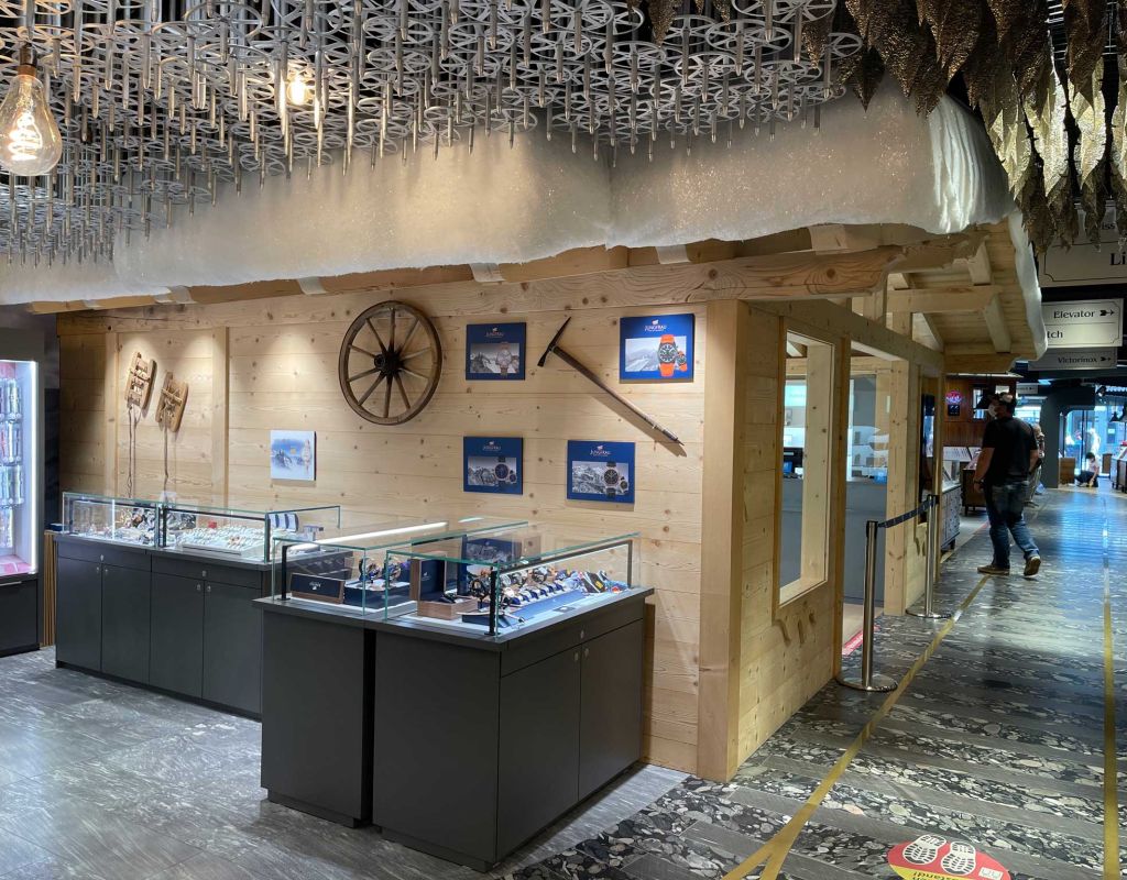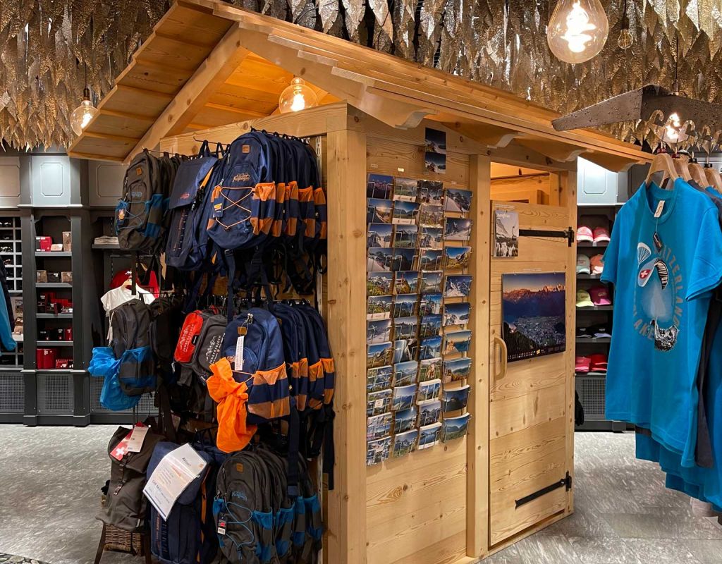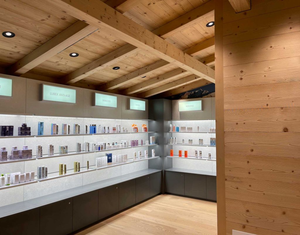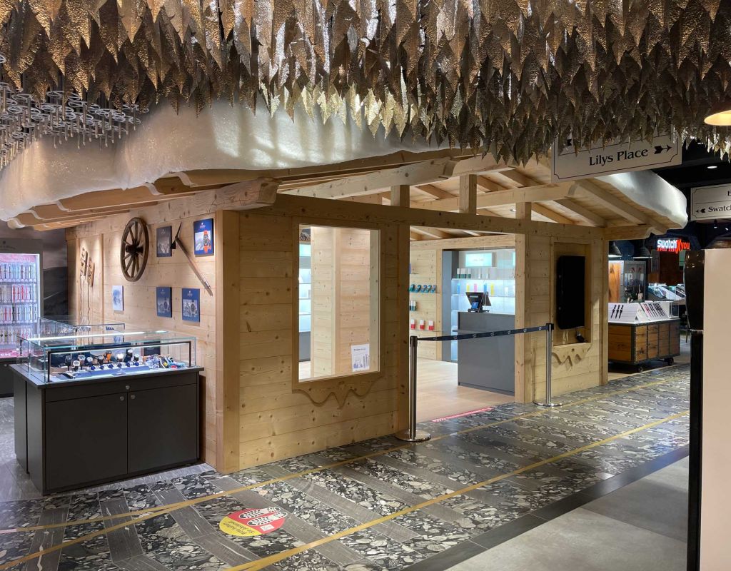 Alpenchic im neuen Top of Europe Flagship Store in Interlaken. Im heimeligen Chalet sind die bekanntesten Marken der Schweizer Kosmetikwelt vertreten. Die rustikale Holzkonstruktion ist ein abwechslungsreicher Kontrast zu den edlen Parfumflacons.